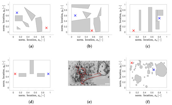 Maps of obstacles for: (a–d) artificial problem instances –, (e) real-life photograph of Apollo 11 landing area [46], and (f) instance based on (e). Markers ’×’ show locations of the robot’s starting point, (red color), and target point, (blue).