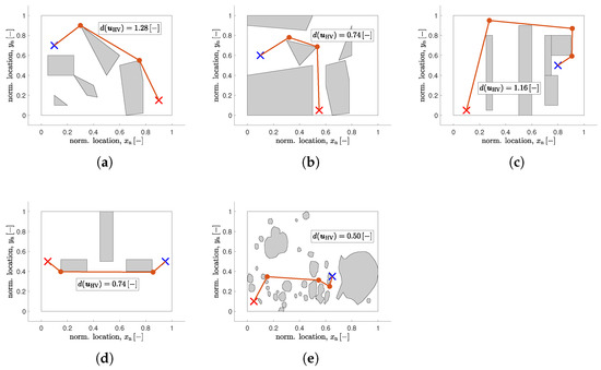 Figure 11 replicates the maps of five pathfinding problem instances –. This time, a final path from the Pareto-optimal set found by the VNDMOPSO algorithm is highlighted with a red curve. The path corresponding to the DSV with the maximal value of the hypervolume metric, , is selected from the Pareto-optimal set. Such a solution dominates the largest portion of the objective space and therefore should not prioritize any of the objectives: the minimal length of the path, and the minimal number of turning points.