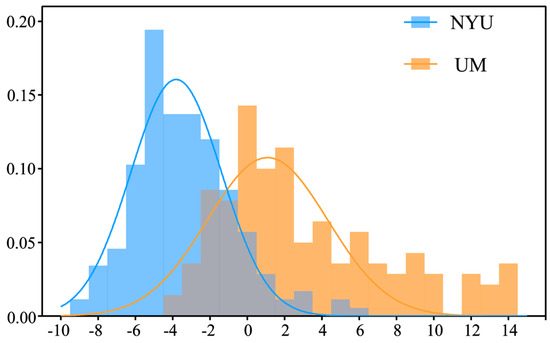 Figure 1 shows the data distribution of NYU Langone Medical Center (NYU) and University of Michigan (UM) sites in ABIDE dataset. Table 1 shows the data distribution for the remaining 15 sites in the ABIDE dataset. Specifically, the first principal component of all subjects at two sites was obtained through PCA, and then the frequency distribution histogram of the first principal component of all subjects at each site was drawn. The PCA algorithm maps functional connections in a high-dimensional space to a low-dimensional space, where the first principal component is the direction of the maximum variance in the data and is the line that best illustrates the shape of the point group. Therefore, the first principal component can be used to reflect the distribution of functional connection data of different sites to the greatest extent. It can be seen that the data distribution of the different sites is heterogeneous.
