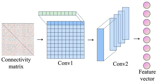The input of the representation learning module is the functional connection matrix, and the physiological meaning is the brain functional network. There are obvious differences between the data structure and the picture, mainly reflected in the fact that the functional connection matrix is a non-Euclidean space and the picture is a Euclidean space. In the Euclidean space of the picture, the neighbors of a pixel are the surrounding pixels in space, so the convolution nuclear energy in the two-dimensional form gathers the information in the neighborhood domain. However, in the functional connection matrix, the neighbor nodes of the target node are not always adjacent in space, so the convolution kernel in two-dimensional form cannot guarantee that all the gathered information comes from the neighbor domain of the target node. This can lead to a mixture of features from different brain regions, which is not conducive to the analysis of important brain regions. The topology of the functional connection matrix is characterized by the fact that each row in the matrix represents the correlation between the brain region corresponding to that row and all the other brain regions. When the functional connection matrix is regarded as a brain functional network, a row in the matrix can also be used as the correlation between the target node and its neighbor node. Therefore, we designed the CNN (1D) representation learning module. The convolution kernel is one-dimensional and contains the same number of weights as the number of brain regions, so that the receptive field of the convolution kernel is exactly a row of the functional connection matrix, which can imitate the interaction between the target brain region and all other brain regions in the row. In this way, each convolution operation gathers the information of the neighbor domain of the target brain region, and the convolution results of each brain region are not mixed with each other, which is conducive to the final analysis of important brain regions. The CNN (1D) consists of two convolutional layers and one fully connected layer, as shown in Figure 4.