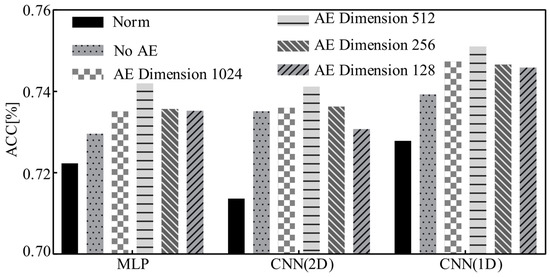 Site features, as vectors quantifying site differences, are the basis for constructing the mapping relationship between representation learning features and site confounding factors. Only on this basis can MS-AINN be used to anti-interference classify the ASD. Therefore, in order to explore the impact of site feature dimensions on classification performance, this experiment tested the classification accuracy of site features extracted by MS-AINN with no AE and AE with different hidden dimensions under the ten-fold cross-verification of the whole site. Meanwhile, the results were compared with the results of the training model of norm neural networks, as shown in Figure 5. No AE means no dimensionality reduction with AE, and the mean vector of the one-dimensional functional connection feature vector of all the subjects in each site after flattening is calculated directly through site average pooling, which is taken as the site feature. The dimension is 19,900. AE Dimension represents the dimension of hidden layer when AE extracts site features, that is, the dimension of site features. It can be seen from Figure 5 that MLP, CNN (2D) and CNN (1D) have improved the accuracy of MS-AINN from 0.5% to 2.75% compared with norm neural networks under different site feature vector dimensions. When AE dimension 512 is used, the MLP accuracy rate increases by 1.97%, CNN (1D) by 2.34%, and CNN (2D) by 2.75% to achieve the optimal performance of the corresponding model. The overall accuracy rate increases first and then decreases with the decrease of site feature dimension. The reason is that different parameters can obtain site features of different dimensions. When the dimension is large, there are more redundant features, and when the dimension is small, site differences cannot be fully expressed.