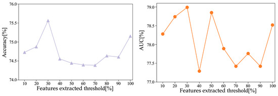 In addition, the phenotypic information correlation features were selected for the site features extracted at AE dimension 512, and the top percentage features with the highest correlation ranking were selected to perform the site feature regression task. A threshold is defined based on the percentage that ranks high in correlation, and the threshold is used as a hyperparameter for optimization. The classification accuracy of MS-AINN-CNN (1D) under different thresholds is shown in Figure 6. The results show that as the feature selection threshold changes from low to high, the accuracy increases first, then decreases and then increases, and reaches the highest accuracy of 75.56% when the threshold is 0.3. With the change of feature selection threshold from low to high, AUC first increased, then decreased and then increased. When the threshold was 0.3, AUC reached the highest value of 78.99%.
