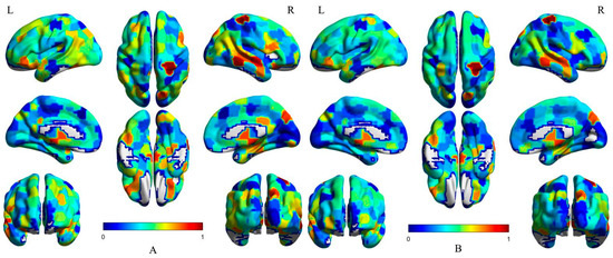 Since CNN (1D) adopts a large-scale convolution kernel considering the topology of brain functional network, and there is a one-to-one correspondence between the weight of the convolution kernel and brain region, we use the results of the normalization of the absolute value of the model weight to represent the classification contribution of brain region, and visualized the CNN (1D) and MS-AINN-CNN (1D), respectively; the results are shown in Figure 7, where A is the result of CNN (1D), and B is the result of MS-AINN-CNN (1D). The redder the color, the higher the relative importance of the brain regions, and the bluer the lower. Brain regions of great relative importance in the two structures include vermis, frontal lobe, posterior cingulate gyrus, orbital part, fusiform gyrus, thalamus, temporal transverse gyrus, precuneus, horny gyrus, caudate nucleus, and hippocampus. These brain regions are the same as those reported in the literature for differences between ASD and TD [7,27,28,29,30,31,32]. This indicates that the representation learning module can actively identify the brain regions that change due to disease, and extract the difference features for classification. Moreover, the high-contribution brain areas in the MS-AINN-CNN (1D) were the same as CNN (1D), indicating that although the MS-AINN-CNN (1D) limited the feature extraction of the representation learning module to remove the confusion of sites, it did not affect the recognition of important brain areas by the model. At the same time, parts of the brain that were bluer became bluer and less important. It shows that the MS-AINN also makes the representation learning module pay more attention to the important brain regions that may have physiological differences and ignore the non-important brain regions. After reducing the weight value of non-critical brain areas, the features extracted contain the difference information of normal patients with important brain areas, and reduce the interference of confounding factors of non-important brain areas, and finally improve the classification performance.