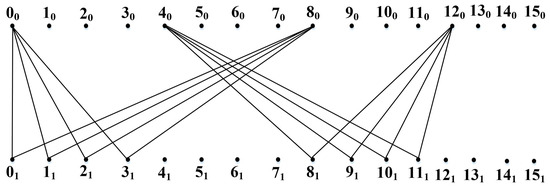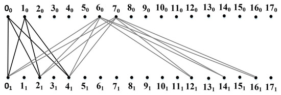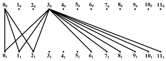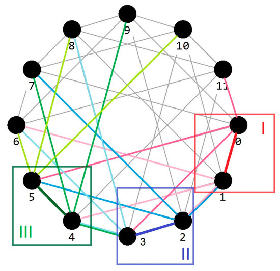 Let us observe this concept with an example. It is known that in on-chip networks, there can be communication links of different bandwidths designed to transmit the traffic of different priorities and implement different levels of virtual channels [54]. The natural structure for complete bipartite graphs is to allocate circulant subgraphs for such tasks [55]. For example, in , a circulant subgraph of the form can be distinguished. The use of a ring circulant allows reflecting the local connectivity of neighboring routers in terms of location on the chip. Although such a circulant is much simpler than a complete bipartite graph, it nevertheless contains quite a lot of links, and the question is how to implement it as a communication environment on chip. Additionally, to implement routing, each router must store a routing table [56] for 12 nodes.