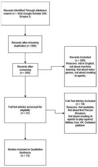 The query used for searching the papers was: “Reinforcement Learning” OR “DQN” OR “Deep Learning” AND “First Person Shooter” AND “bot”, considering results only from 2018 to 2022.