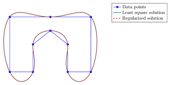 We compare the subdivision curves generated from the control point vectors and ; firstly in terms of interpolation, which is the main goal. With this purpose, consider the residuals , , and which are vectors of points. Notice that the last two residuals are independent from the systems of equations but they are related to the interpolation problems (10) and (14) with the regularized solution.