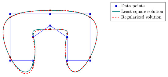 Point interpolation with a quintic B-spline curve (that belongs to the J-spline family). Green solid line: least square solution. Red dashed line: regularized solution.