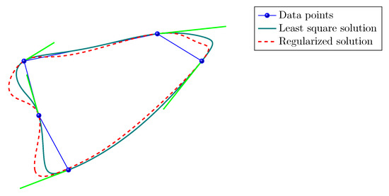 Point and tangent vectors interpolation with a quintic B-spline curve (that belongs to the J-spline family). Green solid line: least square solution. Red dashed line: regularized solution.