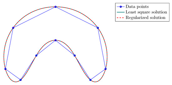 However, if we consider a known solution , we can generate from the columns of and obtain, for a suitable parameter , a solution that interpolates the points as accurately as the least square solution (see Figure 11 in which ), even though the spectra of and are different (see Figure 12).