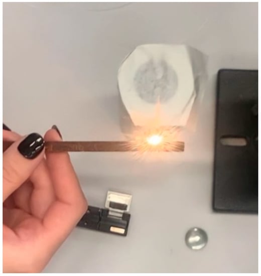 During mathematical simulation on the basis of Equations (1)–(10), the temperature field in the optical fiber and duralumin plate was calculated, and the boundaries of temperature fronts corresponding to the regions where various phase states of quartz glass can occur, namely liquid, gaseous and plasma, were determined. The melting temperature of quartz (optical fiber) corresponds to 1440 K, vaporization in the fiber corresponds to 2706 K, and plasma formation starts at 5000 K.