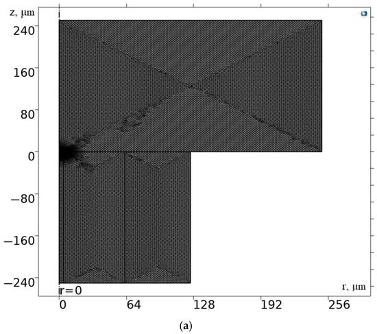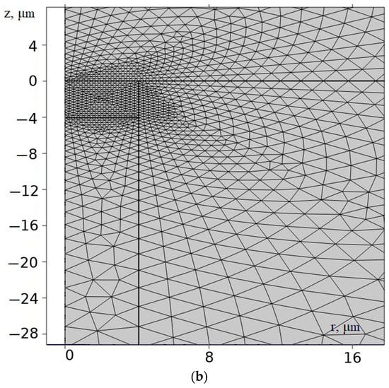 In the entire computational region (Figure 3 and Figure 4), except for the region near the S14 boundary, where intensive heating takes place, a computational mesh with the same size elements of 2.5 μm was introduced. A small region with linear dimensions equal to the fiber core radius was isolated in the vicinity of the S14 boundary, where the computational mesh was milled for the best resolution of the temperature field.