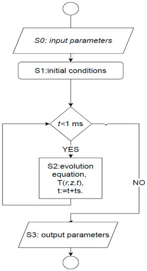 Within the framework of the mathematical model, the distribution of the temperature field T (r, z, t) in the entire computational domain (Figure 3) is described via the following heat conduction equation [20]: