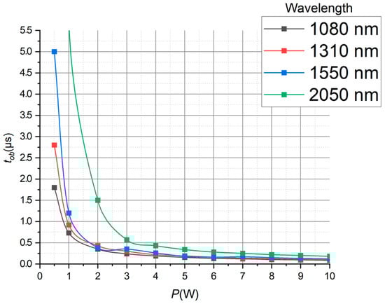As seen in Figure 8, the time required for the initiation of optical breakdown in the fiber decreases with increasing power according to the law close to the exponential one. At high radiation powers (Pmax = 10 W), the plasma spark initiation time lies in a narrow time range from 0.09 µs for λ0 = 1080 nm to 0.18 µs for λ0 = 2050 nm. At low radiation powers, the initiation time increases with increasing wavelength.