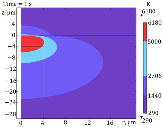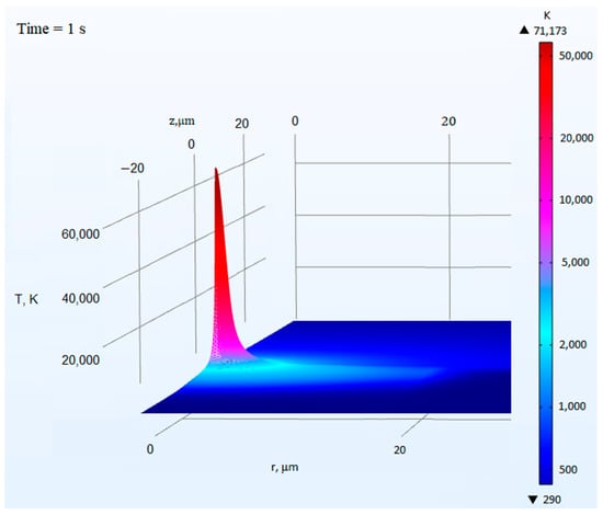 The results of numerical calculations presented in this paper and in the works of other authors [7,8,9] have shown that significant temperatures of the order of tens or even hundreds of thousands of kelvins are reached during optical breakdown inside the fiber core. However, it should be noted that such high-temperature values are localized in the center of the plasma region. Figure 11 shows an example of the temperature field for radiation with a wavelength of λ0 = 1550 nm and power P = 2 W after 1 ms of the introduction of radiation.