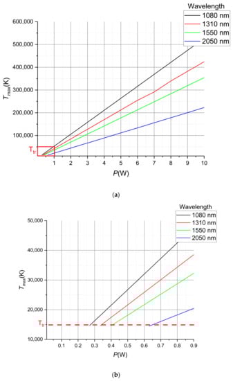 Figure 10 shows a graph of the maximum temperature Tmax at the center of the plasma spark initiated in the fiber core as a function of the injected optical power after 1 s from the start of the input for four wavelengths. It can be seen that Tmax increases linearly with increasing optical radiation power and decreases with increasing wavelength. Table 4 shows the values of maximum temperatures for the minimum powers of radiation initiating the fiber fuse effect. It can be seen that for all wavelengths and powers, this temperature is close to 14,500 K. In Figure 10b, this threshold temperature is indicated by the dotted line.
