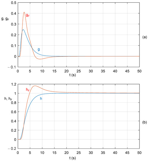 (a) Impulse responses gF and g, (b) step responses hF and h of the commensurate system with transfer function (55) and associated IOS with α = 1.