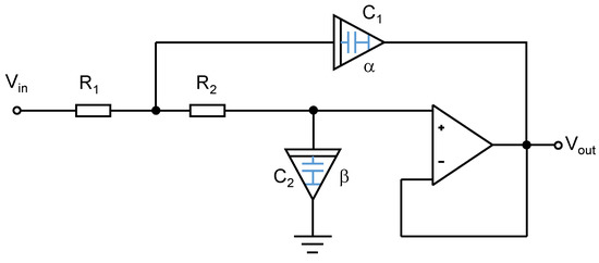 Figure 2 shows a simplified version of the Sallen–Key filter from [35] with an operational amplifier as the voltage buffer. Instead of classical capacitors, fractors of the impedances 1/(sα C1) and 1/(sβ C2) are used, where α, β ∈ R+.