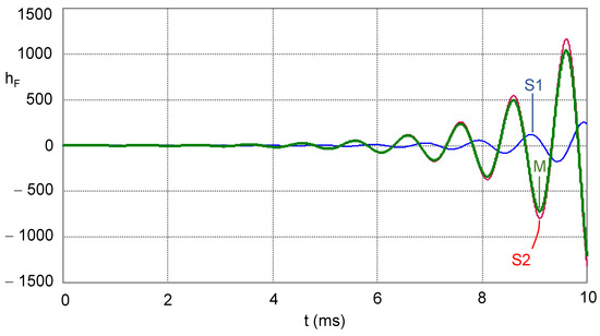 Simulated step responses hF of the commensurate Sallen–Key filter with transfer function (59) for α = 1.15 and Q = 5 (unstable mode); S1 (SPICE-Micro-Cap, Method 1), S2 (SPICE-Micro-Cap, Method 2), M (MATLAB, basis functions).