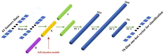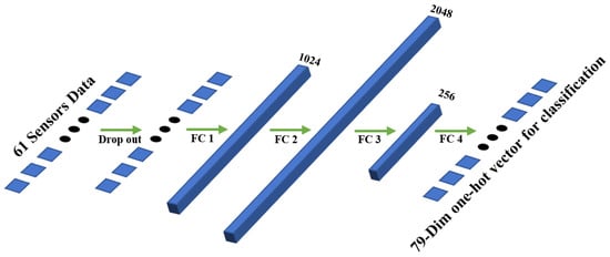 The input of the 61 sensors’ data is fed into a drop out layer []. The dropout layer deactivates the gas concentration of a certain sensor with a fixed probability. Dropout is a technique for improving neural networks by reducing overfitting. Implemented in this model, dropout can not only improve the performance of model but naturally simulate the situation of sensor failure. Then, FC layer 1, FC layer 2, FC layer 3, and FC layer 4 are four fully connected layers with 61 × 1024 neurons, 1024 × 2048 neurons, 2048 × 256 neurons, and 256 × 79 neurons.
