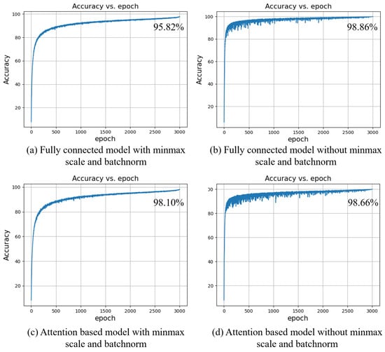 Figure 7 shows the accuracy curve for the test set after 3000 epochs of training. The fully connected model with input data scaled and batchnorm layers reaches a final accuracy of 95.82%, while the model which does not utilize those methods performs better, with a final accuracy of 98.86%. Additionally, according to the experiment, under the same conditions, normalizing the input data makes the convergence speed of the model slower. Even if 1000 more training epochs are given, the accuracy curve on the left side will not continue to increase, which means there is no room for improvement. As for the attention-based fully connected model, the situation is approximately the same with or without data normalization. However, with the input data normalized, the attention-based model improves a lot compared to the model without attention. The attention module is indeed more suitable for catching the inner relationship of the normalized data. There remains an advantage of data normalization: it makes the training curve smoother and more stable.
