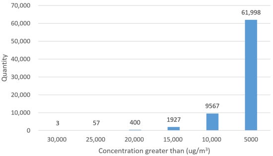 This histogram reveals that there are 3 datapoints greater than 30,000 μg/m3, 57 datapoints greater than 25,000 μg/m3, etc. Under the consideration that scaling with the maximum data directly may result in other data tending to zero, a filtering operation is adopted to reduce the variance of the data by clipping the high values. The result is that the more data that are clipped, the worse the performance of the model.