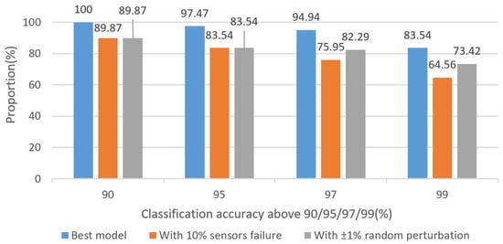 For further verifying the robustness, a random data noise from −1 to 1% is added to each sensor’s concentration separately. This data perturbation only leads to an accuracy decline of 1.75% compared with the original model. The model’s prediction accuracy is still greater than 97%.