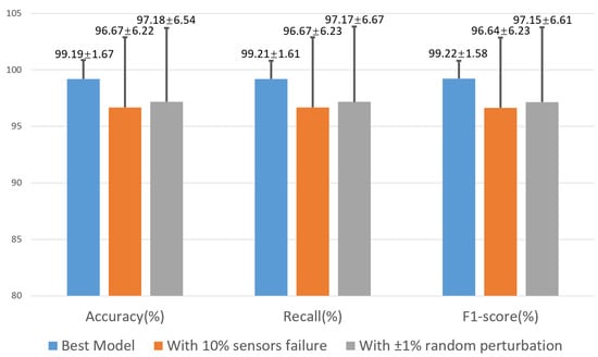 Utilizing a refined hybrid training strategy, the proposed source tracking model achieves a final accuracy of 99.14% classifying 79 dispersed sources using only 61 gas concentrations as input. Our proposed model performs well without prior information such as wind speed and direction. Except for two sources, whose tracking accuracy is 91% and 92%, the others are all above 95%, as shown in Figure 11. Figure 12 shows the average and standard deviation of the accuracy, recall, and F1-score achieved by our best model, the model with 10% sensor failure, and the model with ±1% random perturbation. The definition of standard deviation is shown below: