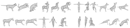We tested our different procedures first on the synthetic TOSCA dataset [,], available at http://tosca.cs.technion.ac.il/book/resources_data.html, accessed on 1 March 2019. We used eight classes of objects from this dataset (see Figure 2: cat, centaur, horse, dog, seahorse, two male figures (Michael and David), and one female figure (Victoria)). Each class consists of the same shapes under different poses and/ or different triangulations. The differences between the poses echo nonrigid transformations within objects (see [,] for details). In addition, the poses within a class are represented with different topologies (i.e., different triangulations), and may even have different genera. The corresponding dataset, TOSCA8, includes six instances in each class, i.e., a total of 48 classes. Each pose is represented with a triangulated surface mesh with approximately 3400 vertices and 6600 faces, with the exception of the seahorse meshes that include approximately 2100 vertices and 4200 faces.