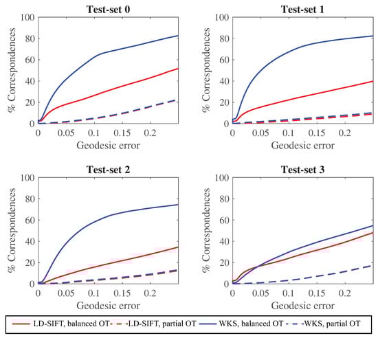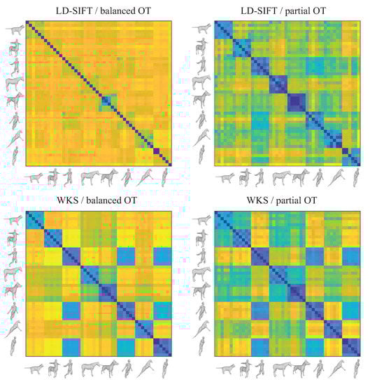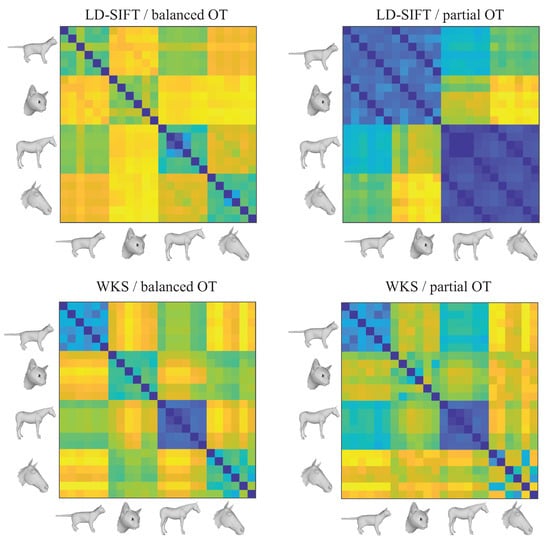 In the first set of experiments, we compared four different approaches for shape similarity, with two different signatures for representing the vertices of the shape, LD-SIFT and WKS, combined with two different methods to compute the correspondences between those vertices, namely, balanced (with fixed masses) optimal transport, which we will refer to as simply OT, and unbalanced (with variable masses) optimal transport, which we will name Partial OT. In each experiment, a pair of shapes is represented with their sets of vertices, and , and the cost matrix C between those vertices, such that between a vertex k on shape 1 and a vertex l on shape 2 is equal to the distance between their signature vectors (see previous section for the choice of distance for the two types of signatures considered). For balanced OT, the masses of the vertices are set as uniform, while for unbalanced OT, we allow for mass creation and deletion. We computed a set of matrices for ranging between 1000 and , such that is the optimized transport energy (balanced OT), or the regularized optimized transport energy (unbalanced OT), i.e., the temperature-based distance between the sets of vertices and of the shapes k and l. Note that for the balanced OT, is a true distance, while for the unbalanced OT, satisfies the first two properties of a metric (identity and symmetry), but not the triangle inequality. We also computed , the matrix of distances at convergence in . See Figure 3 for graphical representations of for the four sets of experiments.