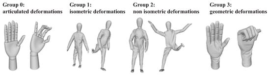 - Dyke, R.M.; Stride, C.; Lai, Y.K.; Rosin, P.L.; Aubry, M.; Boyarski, A.; Bronstein, A.M.; Bronstein, M.M.; Cremers, D.; Fisher, M.; et al. Shape Correspondence with Isometric and Non-Isometric Deformations. In Proceedings of the Eurographics Workshop on 3D Object Retrieval, Genova, Italy, 5–6 May 2019; Biasotti, S., Lavoué, G., Veltkamp, R., Eds.; The Eurographics Association: Eindhoven, The Netherlands, 2019. [Google Scholar]