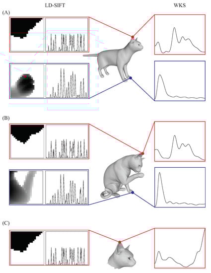 The difference between the results for full shape comparison and partial shape comparison requires some clarifications. First, the LD-SIFT signatures outperform the WKS signatures for partial shape comparison, while we observe the opposite for full shape comparison. These different behaviors are attributed to the way those signatures are generated. We illustrate the differences in Figure 8. In this figure, we represent the LD-SIFT signatures as well as the WKS signatures at corresponding vertices at the tip on one ear of a cat and at the end of one paw, for two different poses, as well as for the vertices at the ear for a mesh that only includes the head of the cat. As illustrated on the right of the figure, the WKS signatures of the corresponding vertices are very similar for the two poses of the cats. In contrast, the LD-SIFT signatures exhibit more differences. Those signatures are computed from a rendering of the mesh in a plane that is local to the vertex of interest. The renderings for the vertex on the ear are similar, while the renderings for the paw are different. The differences in the images are mitigated by the fact that the SIFT signatures are computed only at the center of the image. It remains that the LD-SIFT signatures are computed from a rendering that relies on extrinsic geometry and as such are sensitive to nonrigid deformation. The WKS signatures differ, as they are computed from the Laplace–Beltrami operator which captures the intrinsic geometry of a mesh, and are therefore less sensitive to nonrigid deformations. Such differences between LD-SIFT and WKS signatures explain the differences observed in Figure 3. Those differences, however, are reverted when we consider partial meshes. The LD-SIFT signatures at the ear of the full cat and of the shape that only includes the head of the cat are very similar (left column, top and bottom row), while the corresponding WKS signatures are very different (right column). The WKS signature is based on the solution of the Schrödinger equation over the whole mesh describing the shape; as such, it remains a global descriptor. This explains the differences observed in Figure 7.