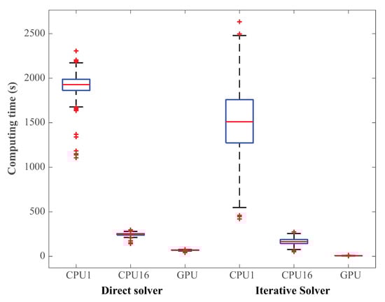 We claimed that the framework we propose in which vertices of two meshes are first characterized using signature vectors and then placed into correspondence using optimal possibly partial transport enables a robust solution to the shape comparison problem. Such a framework, however, would be nonpractical if it proved to be computationally too expensive, a common criticism for methods that rely on optimal transport. We tracked the running times for our technique for the many experiments mentioned above to make sure that this is not the case. As we solve a nonlinear system of equations iteratively at each inverse temperature, we first note that our implementation of optimal transport heavily relies on linear algebra. Each iteration requires the solution of a linear system of equations, the linearized SPA system, which can be solved either directly or iteratively. Thus, it is anticipated that parallelization will have a significant positive impact on the entire algorithm. As a result, we created two versions of our comparison process: one that utilizes GPUs and maybe multiple CPUs. Both largely rely on the processor-specific optimized BLAS and LAPACK libraries. For the direct solver of the SPA system, we used the LAPACK routine dsysv on CPU, and the CUSOLVER routines DnDgetrf and DnDgetrs on GPU, based on CUDA. For the alternate iterative solver, we implemented a conjugate gradient solver with an incomplete LU (ILU) preconditioner. The distributions of the computing times for the different implementations of our framework (direct or iterative solver, and CPU or GPU implementations) are shown in Figure 9, while the means of those distributions are provided in Table 6. As expected, we observe a significant speedup when the comparisons are run on multiple processors: factors of 7.8 and 9.2 for the direct and for the iterative solver on an 8 CPUs/16 threads system, respectively, and factors of 28 and 241 for the same solvers on GPU. The improvement in computing time is much greater for the iterative solver. This is expected, as direct dense solvers are not yet as optimized on GPUs than they are on CPUs. We do observe that the iterative solvers are faster than the direct solver, and we advocate using the former.