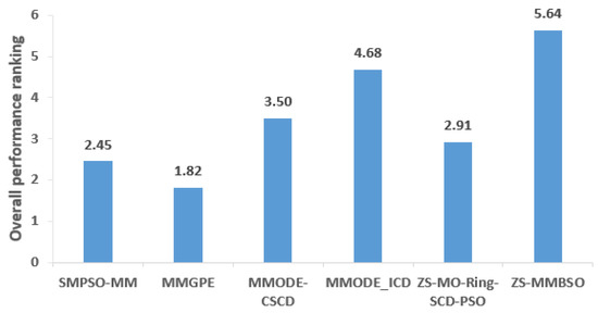 From Table 1, it is observed that the ZS-MMBSO significantly outperforms the SMPSO_MM, the MMGPE, the MMODE_CSCD, and the ZS-MO_Ring_PSO_SCD in terms of PSP on all MMOPs. The main reason may be that the ZS can greatly reduce the problem complexity, and the BSO algorithm has good global search capability. Namely, the proposed algorithm can integrate the advantages of “soft isolation” and “hard isolation” to maintain the population diversity. Therefore, compared with other competitors, the ZS-MMBSO can preserve more equivalent Pareto optimal solutions. Compared to the MMODE_ICD, the ZS-MMBSO wins 20 test functions. Clearly, the overall performance of the proposed algorithm is significantly better than that of the MMODE_ICD. For the other two remaining MMOPs (i.e., the SYM_PART simple and the Omni_test), the MMODE_ICD performs better. For the SYM_PART simple, most PSs are distributed in the boundary regions of subspaces, thus it is difficult for the ZS-MMBSO to search equivalent Pareto optimal solutions. For the Omni_test, the distribution of PSs in different subspaces is imbalanced, thus the proposed algorithm may waste computing resources. To visualize the performance comparison of all algorithms, the Friedman test rankings are illustrated in Figure 1 and the ZS-MMBSO owns the best ranking among all compared algorithms. The above statistical results indicate the superiority of the ZS-MMBSO in decision space.