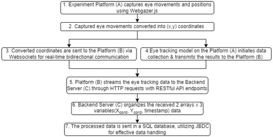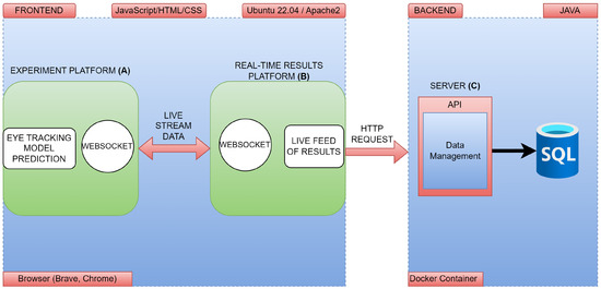 The front-end is specifically designed to integrate the eye-tracking model and provide a clear presentation of its live results. Moreover, data transfer between the experiment platform (A) and real-time results platform (B) is carried out via WebSocket. Subsequently, these data are transmitted to the back-end server via an HTTP request and stored in the database. The front-end is the preferred implementation location for eye-tracking models to ensure a more robust privacy strategy. Since sensitive data, such as eye-tracking information, is processed in this system, the aim is to perform all computations exclusively on the computer being used, without involving external servers or sources. This strategic approach is motivated by the fact that various models, including eye-tracking models found in the literature, perform computations on snapshots captured by the user’s webcam [46,47]. Processing these images on an external server is considered to introduce potential security vulnerabilities. Therefore, all computations are configured to take place only on the computer running the experiment, and only the results are transferred to other platforms and servers.
