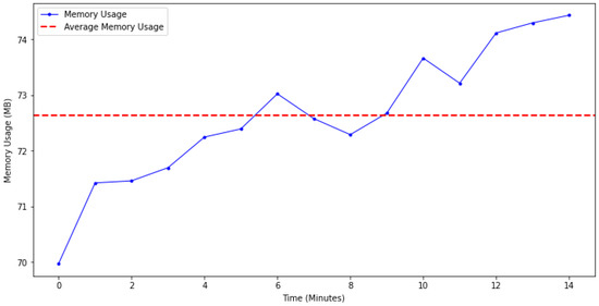 In addition, analysis of the memory usage data revealed interesting results (see Table 3). The average increase between seconds was measured as 0.0037 MB. The average memory usage during the session was measured as 72.62 MB with a minimum of 63.74 MB, and the maximum memory usage was 83.62. The standard deviation of memory usage was calculated at 3.48 MB.