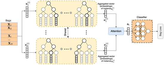Embeddings are aggregated by using, for example, the averaging operation, resulting in vectors , , corresponding to the i-th bag. Then, aggregated embeddings are attended to in order to obtain a final representation of the i-th bag in the form of vector , which is classified. This motivated us to replace the class probability distributions at the tree leaves with the embeddings defined above. We can define several ways to construct embeddings from class probability distributions. However, we selected a simple procedure, which has demonstrated its efficiency from the point of view of accuracy and computationally.