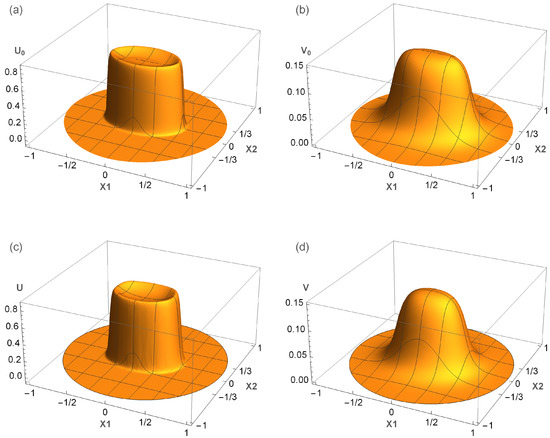 - From the equalities in Equation (20), algebraic equations are obtained, from which we define the functions :where are known functions decreasing exponentially to zero as ; in the first order they are as follows:Here, we have taken the identities into account and the first part of Equation (19) for .