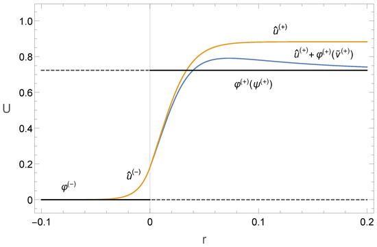 - We determine the functions from the equations obtained from Taylor expansion in the small parameter of the equalities in Equation (23) with supplementary conditions at infinity:where are known exponentially decreasing functions (see [17]).