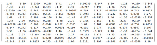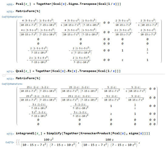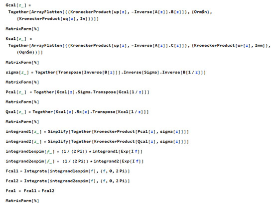 Theorem 1. Under the assumptions of Lemma 1 and if , a sufficient condition of invertibility of the Fisher information matrix, , associated with the VARMAX model with the matrix polynomials , and of degree , respectively, is that the reciprocal matrix polynomials , , and have no common eigenvalue.