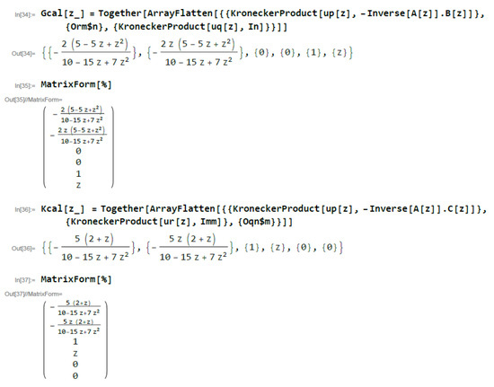 Now, if the lack of identifiability occurs because (ii) in Lemma 1 is not satisfied, that means that the matrix has a rank strictly smaller than n. Consequently, row n, say, of that matrix is a linear combination of the other rows and the matrices , , and do not have full rank. Hence the determinants det, det, and det are polynomials of degree strictly smaller than, respectively, , , and . Each of the reciprocal matrix polynomials , , and have at least an eigenvalue equal to 0, hence at least one common eigenvalue. □