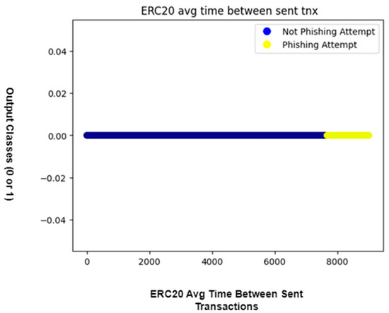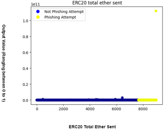 Many of the features were co-dependent on each other, many other features either had the same value or a small number of outliers, and all other datapoints lay in the same range. All such parts were eliminated in the preprocessing stage. Some of those features are illustrated below: Figure 2 shows the datapoint distribution concerning ERC20 average time between sent TNX. From a different perspective, Figure 3 illustrates a single outlier with all other datapoints having the same value for feature: ERC20 total Ether received.