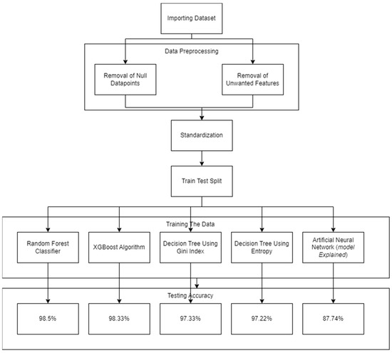 The project focused on four different models of classification, namely the random forest classifier, XGBoost classifier, decision tree using Gini index, and decision tree using entropy. As graphically depicted in Figure 4, Random Forest noticeably provided the best accuracy rate of 98.5%, while the XGBoost classifier scored second with 98.33% accuracy rate. The used models were based on their implementations in the sklearn library in Python.