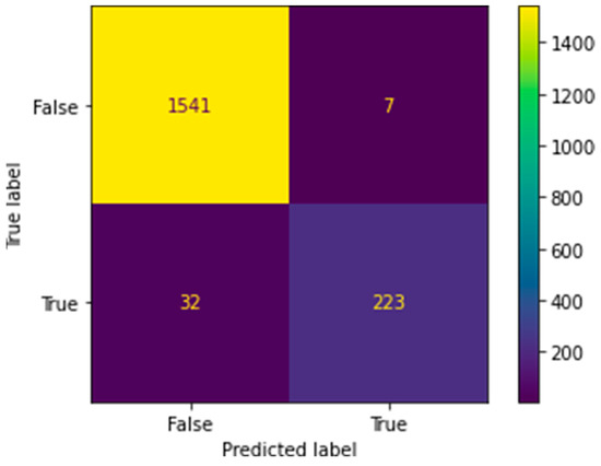 It was observed that the random forest classifier presented the best accuracy at 30 features from all the models tested on the dataset. It provided us with 98.5% accuracy, and the XGBoost classifier provided 98.33% accuracy as it can be noticed in Figure 4. These two models are the most accurate machine-learning implementations and can be used further on for real-time applications in Ethereum networks as well. Figure 5 and Figure 6 represent the confusion matrix for random forest and XGBoost. Therefore, considerations are drawn on false positives, false negatives, true positives and true negatives.