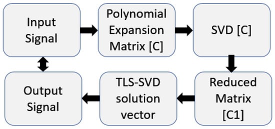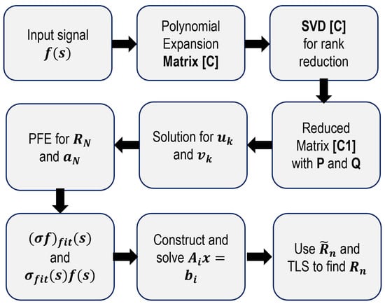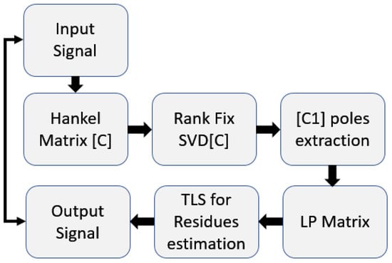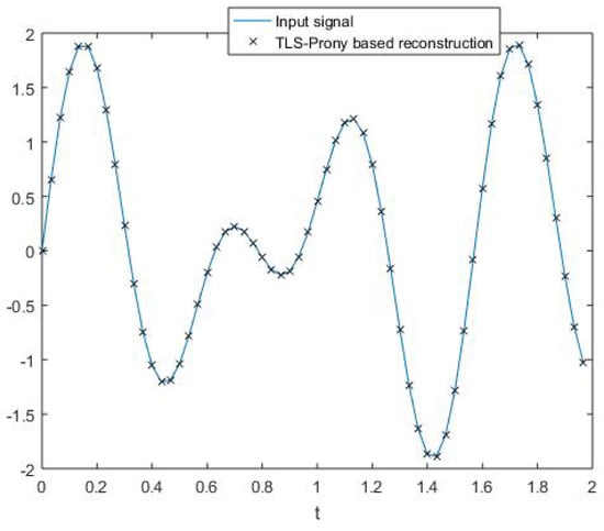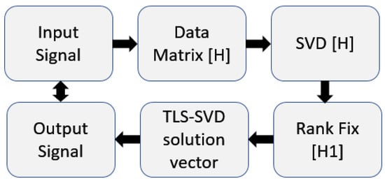 Now, returning to (11), the TLS solution approach can be used to solve the equation and find the residues [], which lead to the general steps for the method from the input signal to the reconstructed one in Figure 7.