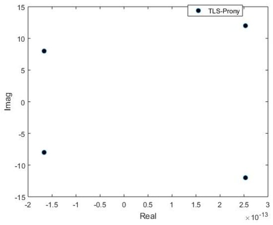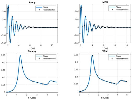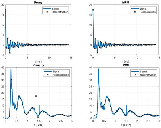 A straightforward validation process occurs in the same way as the ones for MPM and Prony’s methods, but this time for a frequency domain benchmark signal . The signal reconstruction comparison and the poles calculated with this method are shown in Figure 8 and Figure 9.