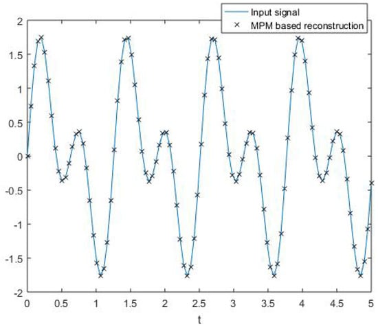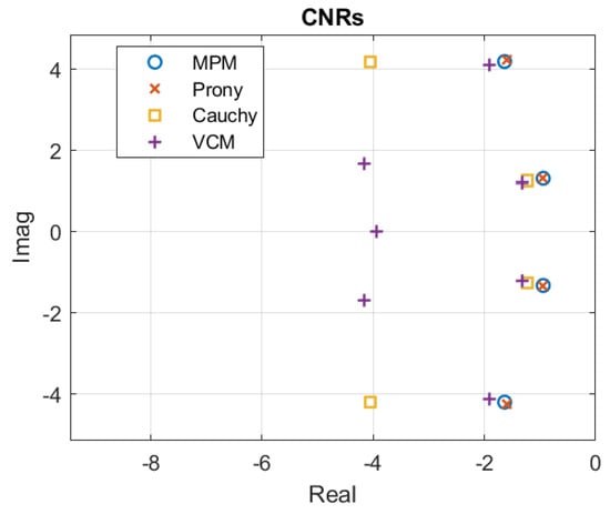 To test the accuracy of the CNRs extracted, a simple test is then carried out with the benchmark signal . Both the input signal and the pole-based reconstruction are compared, and the poles calculated through MPM are shown in Figure 5 and Figure 6, respectively.