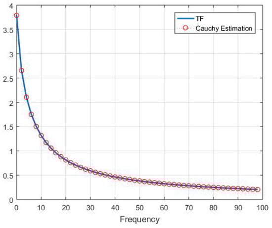In the frequency domain, this method was presented in 1821 by Cauchy, approximating a function by a ratio of two polynomials []. After that, it has been applied to the solution to electromagnetic problems modeling the system frequency response in the same way []. It assumes that the response is completely linear-time-invariant (LTI); thus, the transfer function can be written as in Equation (11) []. Equation (12) can be constructed with the coefficients and and then having as in Equation (13). As in the MPM approach, the SVD is applied to and a threshold to have the smallest singular value greater than or equal to the number of significant decimal digits of data in (14) and (15), having w as the number of accurate significant decimal digits in the data from the response.