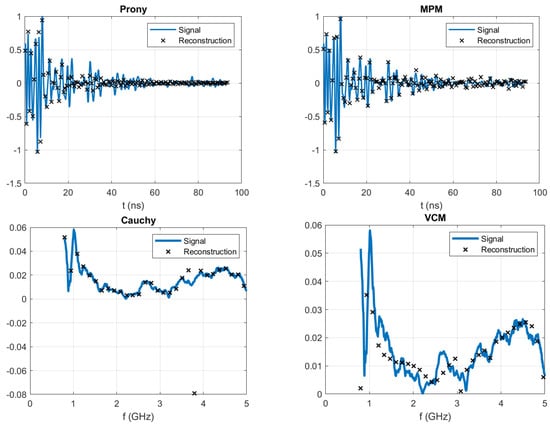 The singularities in the time or frequency domain can be calculated using methods such as matrix pencil method (MPM), Prony’s method, Cauchy’s method, or vector-fitting Cauchy method (VCM) [,,,,,,]. However, besides VCM, there is no reconstruction of the signal validated through numerical results that validate the poles for object identification scenarios or any analysis for real-time implementation. The main reason for this article is, then, to provide an insight into the advantages and disadvantages of each algorithm for several scenarios to extract useful information with the right procedure, and also obtain performance metrics such as execution time, number of samples, and accuracy. These metrics can subsequently serve as a basis for the selection or design of a hardware platform that conforms to the desired levels of accuracy, execution time, and number of samples required by the application.