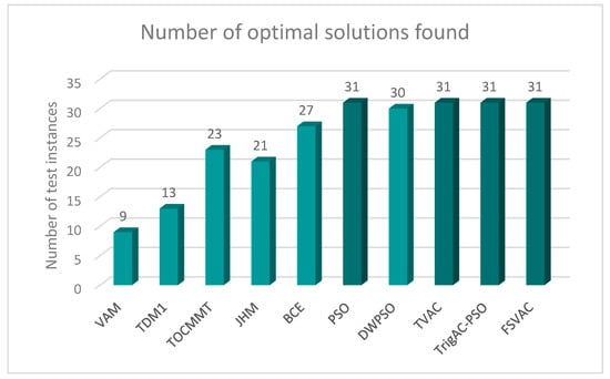 In the following table (Table 2) and Figure 1, the performance of both the exact methods and the PSO-based ones are presented for 30 Monte Carlo runs; more precisely, the best value achieved by each method is depicted. The last column presents the optimal solution of each numerical problem. As shown, the Vogel method manages to find 9 out of the 32 test instances (28.13%); the Total Differences Method 1 (TDM1) succeeds in finding more optimal solutions than the Vogel method by finding 13 out of 32 optimal solutions (40.63%); using the TOCM-MT method, the results show that the method’s performance is better still, finding the optimum in 23 out of 32 test instances (71.9%); the JHM method, which accumulated 21 optimal solutions, was less effective than TOCM-MT (65.62%); the BCE method, which achieved 27 out of 32 test instances (84.4%), proved to be the most efficient compared to all previously mentioned methods; the classic PSO, the TVAC, the TrigAC-PSO and the FSVAG-PSO achieve the optimum in 31 out of 32 test instances (96.88%), while the PWPSO achieves the optimum in 30 out of the 32 (93.76%).
