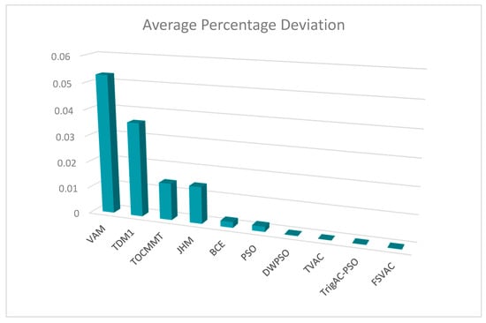 One significant finding of our research is that the new PSO variation, TrigAC-PSO, which is first presented in this study, achieved very good results. The following table (Table 3) examines the deviation of VAM, TDM1, TOCM-MT, JHM, BCE, PSO, DuPSO, TVAC, TrigAC-PSO and FSVAC-PSO. The measurement of deviation shows the difference between the observed value and the expected value of a variable, and it is given by the following formula: